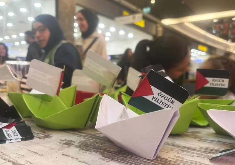 Alışveriş merkezleri, Türk ve Filistin bayraklarıyla süslenirken, Gazze’deki soykırımın fotoğraflarının sergilendiği bir alan da oluşturuldu.