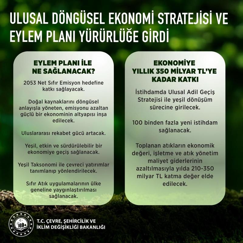 “2053 Net Sıfır Emisyon hedefimize ulaşmak için önemli bir adım olan ‘Ulusal Döngüsel Ekonomi Stratejisi ve Eylem Planı’mız artık yürürlükte. Yedi sektörü kapsayan bu eylem planı ile atık maliyetlerini azaltmanın yanı sıra, ekonomiye yıllık 350 milyar lira kadar katkı sağlamayı ve 100 binden fazla yeni istihdam oluşturmayı hedefliyoruz.”