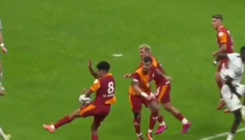 Ceza sahasına yapılan ortada Trabzonsporlu Ernest Muçi’nin vuruşu, Galatasaraylı Gabriel Sara’dan geri döndü. Bu pozisyonun ardından Trabzonspor oyuncuları, hakeme penaltı itirazında bulundular.