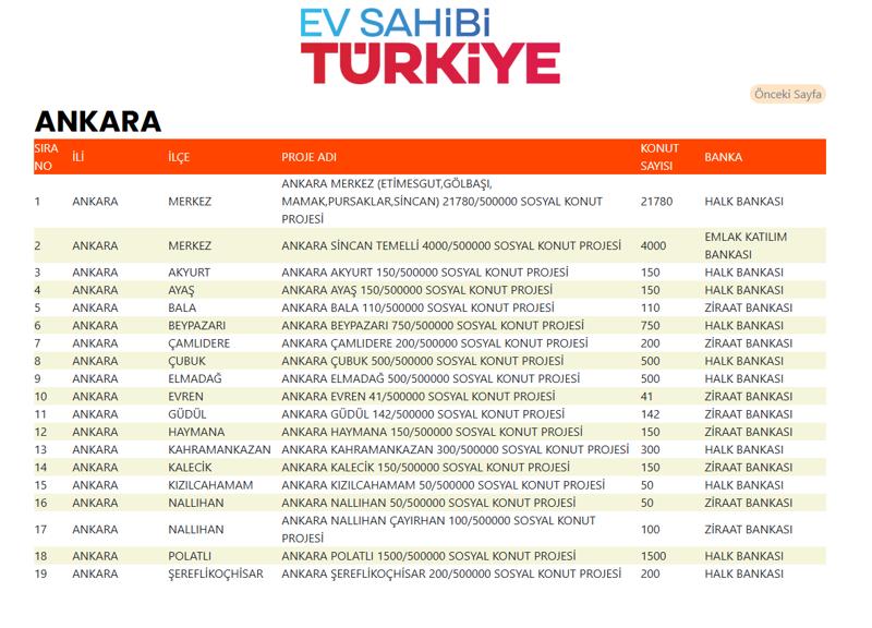 Ankara’da ise 30 bin 823 konut, Etimesgut, Gölbaşı, Mamak, Pursaklar, Sincan, Akyurt, Ayaş, Bala, Beypazarı, Çamlıdere, Kızılcahamam, Çubuk, Elmadağ, Evren, Güdül, Haymana, Kalecik, Kahramankazan, Nallıhan, Polatlı ve Şereflikoçhisar gibi 21 ilçede gerçekleştirilecek.
