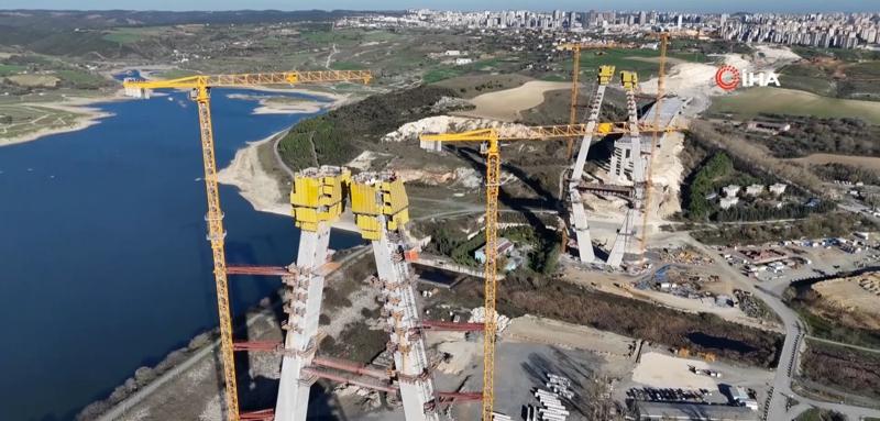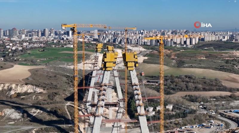 Kanal İstanbul projesinin önemli bileşenlerinden biri olan Sazlıdere Köprüsü’nün ayakları, 170 metre yüksekliği ile dikkate değer bir ilerleme kaydetti. Başakşehir, Kayaşehir ve Bahçeşehir hattını birbirine bağlayacak olan köprünün inşaatı, Kuzey Marmara Otoyolu’nun Başakşehir – Nakkaş kesimi ile birlikte hızla sürdürülüyor. Yol çevresindeki hafriyat kamyonları ve iş makineleri, yoğun bir şekilde çalışmalarını sürdürmekte.