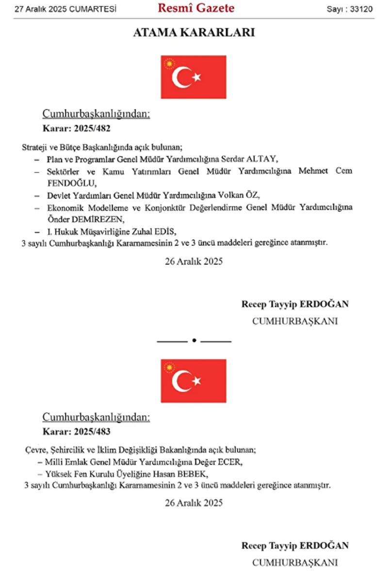 Bu kapsamda, Strateji ve Bütçe Başkanlığında boş bulunan Plan ve Programlar Genel Müdür Yardımcılığına Serdar Altay, Sektörler ve Kamu Yatırımları Genel Müdür Yardımcılığına Mehmet Cem Fendoğlu, Devlet Yardımları Genel Müdür Yardımcılığına Volkan Öz, Ekonomik Modelleme ve Konjonktür Değerlendirme Genel Müdür Yardımcılığına Önder Demirezen ve Birinci Hukuk Müşavirliğine Zuhal Edis atandı.