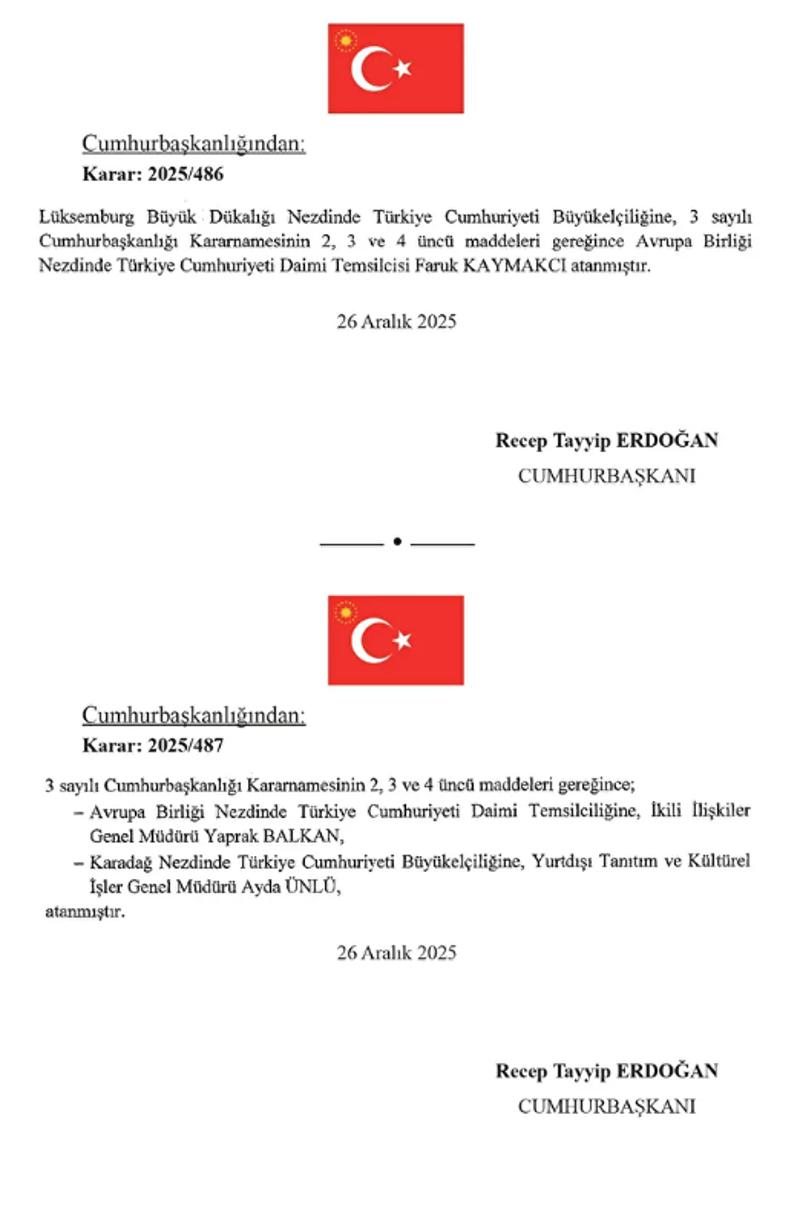 Cumhurbaşkanı Erdoğan’ın onayıyla, Lüksemburg Büyük Dükalığı nezdinde Türkiye Cumhuriyeti Büyükelçiliğine Faruk Kaymakçı atandı. Avrupa Birliği nezdinde Türkiye Cumhuriyeti Daimi Temsilciliğine ise İkili İlişkiler Genel Müdürü Yaprak Balkan, Karadağ nezdinde Türkiye Cumhuriyeti Büyükelçiliğine de Yurtdışı Tanıtım ve Kültürel İşler Genel Müdürü Ayda Ünlü getirildi.