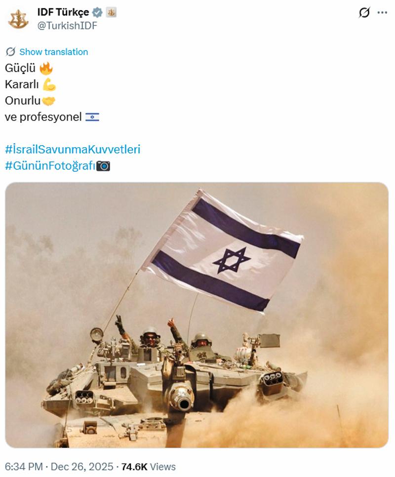 İsrail Savunma Kuvvetleri’nin Türkçe sosyal medya hesabından, Türkiye’nin Milli Savunma Bakanlığı’nın yaptığı bir paylaşıma benzer bir paylaşım yapıldı. Milli Savunma Bakanlığı’nın hesabında, Türk askerinin bir tankla beraber görüntülendiği fotoğrafa yer verilerek “Güçlü, cesur, korkusuz” ifadesi kullanıldı.