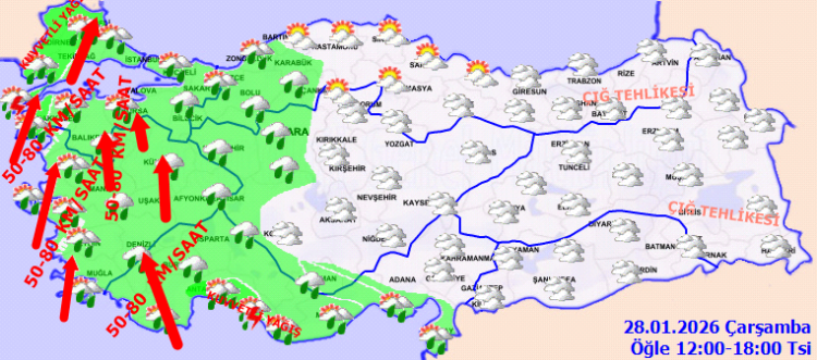 Yağışların; Marmara’nın batısı, Kıyı Ege ve Batı Akdeniz ile Manisa ve Denizli’de yerel kuvvetli olması bekleniyor. Rüzgarın; Marmara’nın güney ve batısı, Ege ve Batı Akdeniz’de güney yönlerden kuvvetli ve zaman zaman fırtına şeklinde (50-80 km/saat) esmesi tahmin ediyor.
