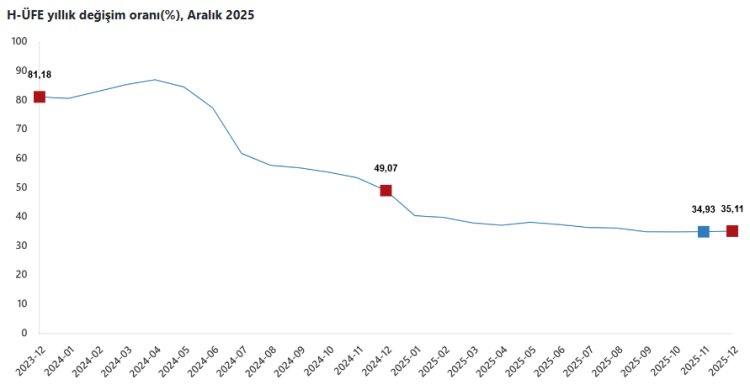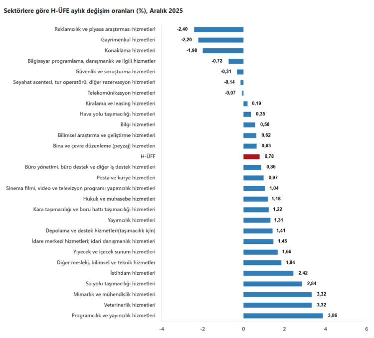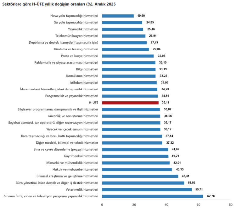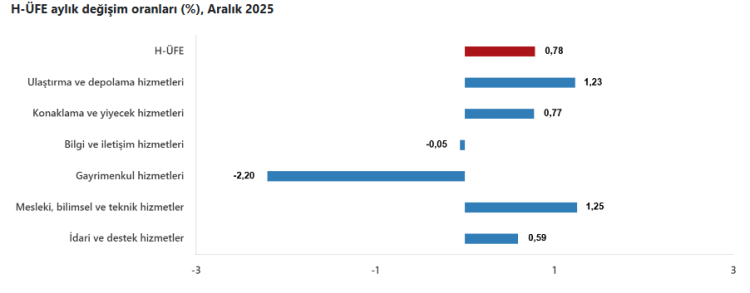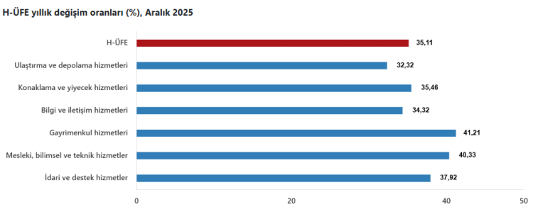 ANKARA (İGFA) – Türkiye İstatistik Kurumu’nun (TÜİK) verilerine göre, Hizmet Üretici Fiyat Endeksi (H-ÜFE) 2025 yılı Aralık ayında bir önceki aya göre yüzde 0,78, bir önceki yılın aynı ayına göre ise yüzde 35,11 artış gösterdi. On iki aylık ortalamalara göre artış oranı ise yüzde 36,78 oldu.