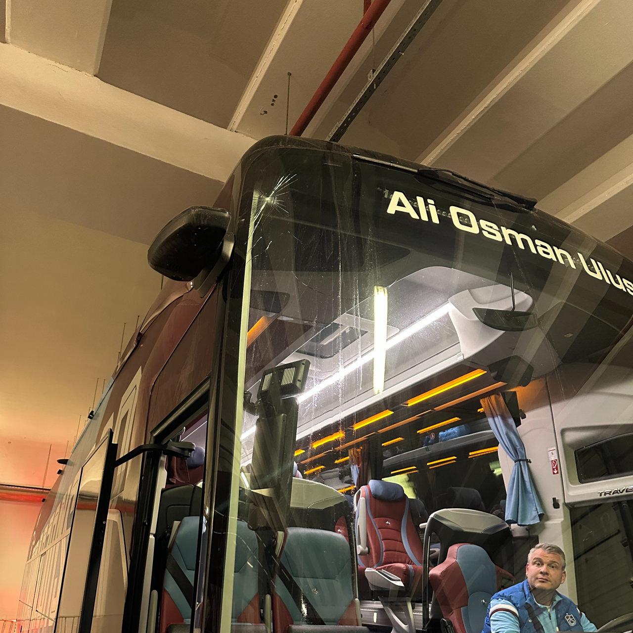 Bordo-mavili kulüpten yapılan açıklamaya göre, maçın oynanacağı Corendon Airlines Park Antalya Stadı’na hareket eden kafileyi taşıyan takım otobüsüne kimliği belirsiz kişilerce taşlı saldırı gerçekleşti.