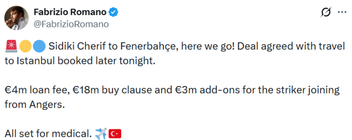 Ara transfer perdesinin kapanmasına günler kala hücum bölgesini güçlendirmek isteyen Fenerbahçe, 9 numara takviyesi için gündemine Sidiki Cherif’i almıştı. Fransız futbolcunun formasını giydiği Angers ile görüşmeler sürerken dünyaca ünlü İtalyan gazeteci Fabrizio Romano, sarı-lacivertlilere müjdeli haberi verdi. Taraflar, transfer görüşmelerinde tam anlaşma sağladı. Yetenekli oyuncunun bu gece ilerleyen saatlerde İstanbul’a seyahati ayarlandı. Sağlık kontrollerinin ardından imzaların atılması bekleniyor.
