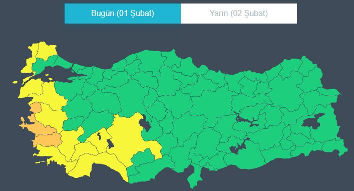 Sarı uyarı verilen iller: Antalya, Balıkesir, Burdur, Çanakkale, Denizli, Edirne, Isparta, Kırklareli, Konya, Manisa ve Muğla.