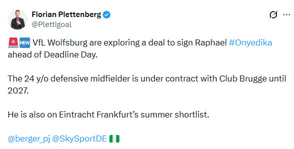 Wolfsburg’un, Onyedika transferi için Club Brugge ile görüşmelerde bulunduğu kaydedildi.