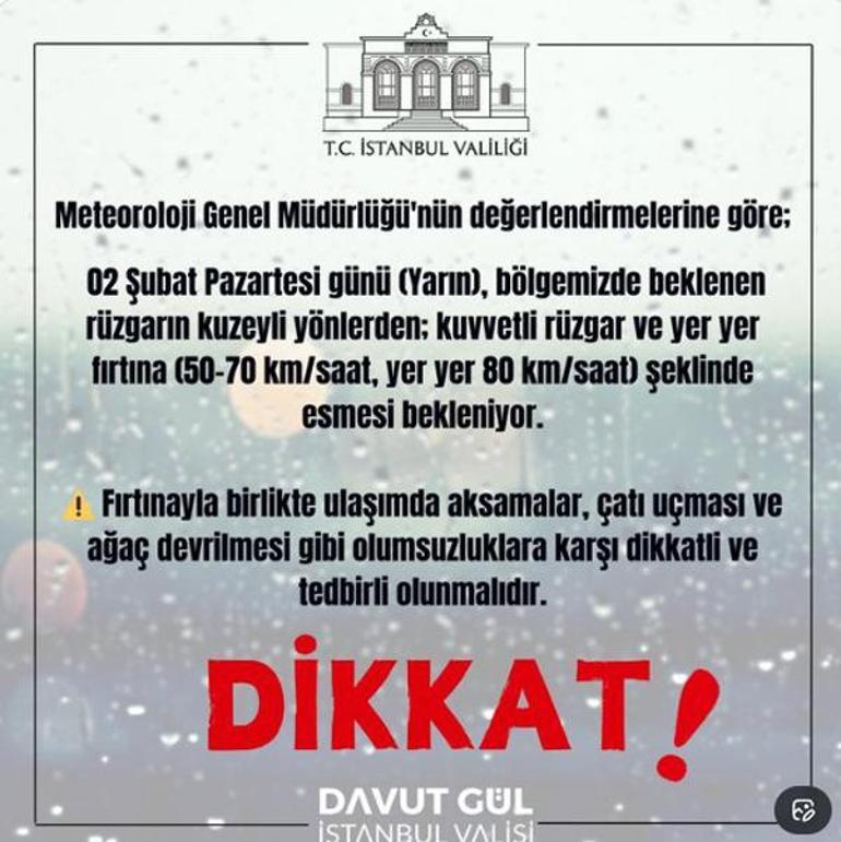 İstanbul Valiliği tarafından yapılan açıklamada, “Meteoroloji Genel Müdürlüğü’nün değerlendirmelerine göre; 02 Şubat Pazartesi günü (Yarın), bölgemizde beklenen rüzgarın kuzeyli yönlerden; kuvvetli rüzgar ve yer yer fırtına (50-70 km/saat, yer yer 80 km/saat) şeklinde esmesi bekleniyor. Fırtınayla birlikte ulaşımda aksamalar, çatı uçması ve ağaç devrilmesi gibi olumsuzluklara karşı dikkatli ve tedbirli olunmalıdır” ifadeleri kullanıldı.