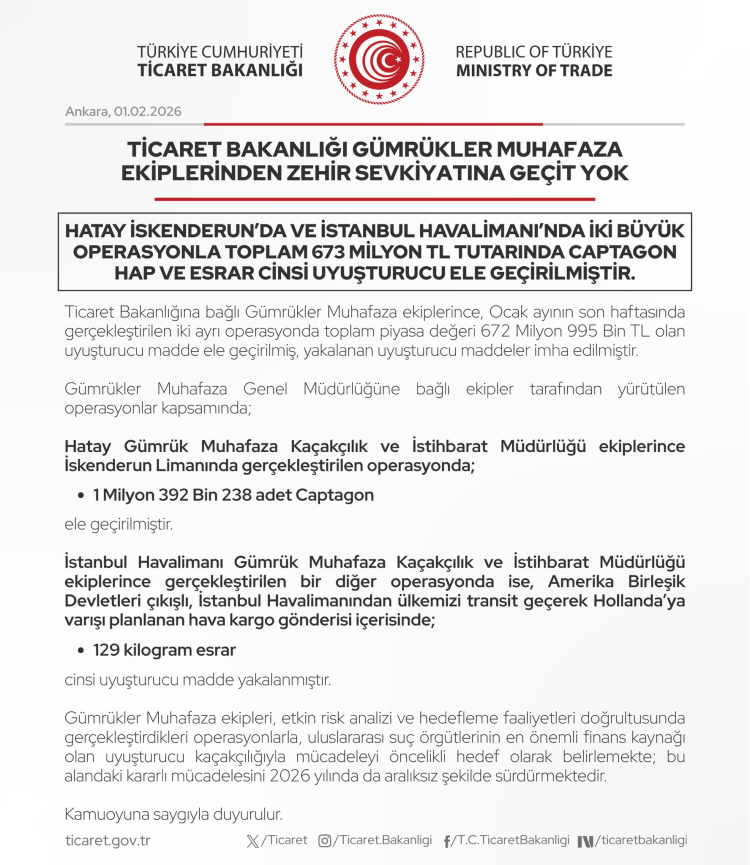 Ticaret Bakanlığı açıklamasında, “Gümrükler Muhafaza ekiplerimiz, etkin risk analizi ve hedefleme faaliyetleri doğrultusunda uluslararası suç örgütlerinin en önemli finans kaynağı olan uyuşturucu kaçakçılığıyla mücadelede kararlılıkla yoluna devam etmektedir. 2026 yılında da bu alandaki aralıksız mücadelemiz sürecektir.” ifadelerine yer verdi.