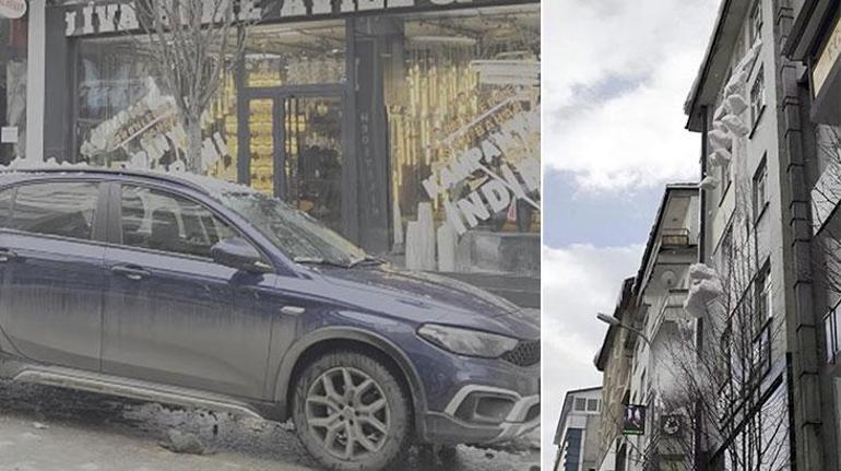 Erzurum Yakutiye ilçesi Lalapaşa Mahallesi Mumcu Caddesi’nde çatıda biriken kar ısınan havayla birlikte düştü. Kar kütlesi yol kenarında park halindeki bir otomobilde hasara yol açtı.