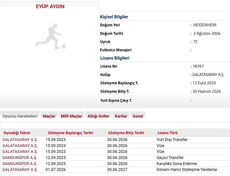 Samsunspor'a kiralanan Eyüp Aydın'ın Galatasaray'a geri döndüğü TFF'ye bildirildi.