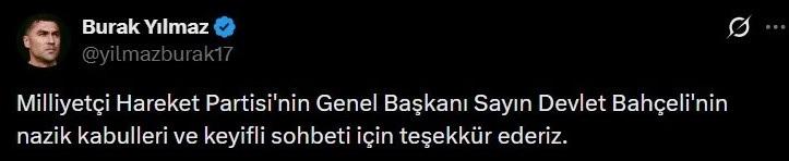 Ziyarette MHP liderine Gaziantep’in plaka kodu olarak 27 numaranın ve Devlet Bahçeli’nin ismi yazılı forma hediye edilirken Burak Yılmaz görüşmeye ilişkin bir paylaşımda bulundu.