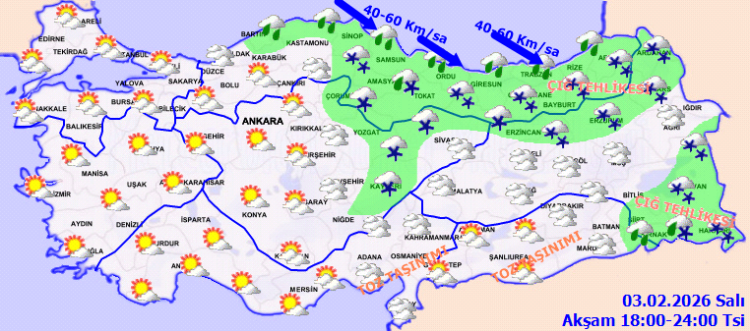Sabah ve gece saatlerinde özellikle doğu bölgelerde buzlanma ve don olayının görülebileceği, Doğu Akdeniz ve Güneydoğu Anadolu’nun güney kesimlerinde ise toz taşınımı beklendiği kaydedildi. Ayrıca Doğu Karadeniz’in iç kesimlerinin yüksekleri ile Doğu Anadolu’nun doğusunda, yüksek kar örtüsüne sahip eğimli alanlarda çığ tehlikesi bulunduğu uyarısı yapıldı.