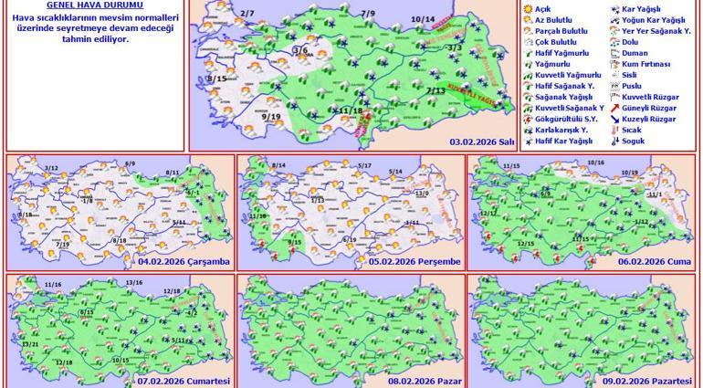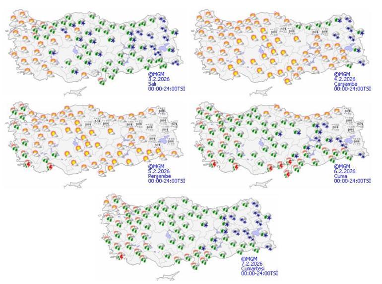 Meteoroloji Genel Müdürlüğü olarak yapılan değerlendirmelere göre: Yurt genelinin çok bulutlu, Marmara ve Doğu Akdeniz’in doğusu, İç Anadolu’nun güney ve doğusu, Karadeniz, Doğu ve Güneydoğu Anadolu Bölgeleri ile Isparta ve Afyonkarahisar çevrelerinin aralıklı yağışlı geçeceği tahmin ediliyor. Genellikle yağmur ve sağanak, Karadeniz’in iç kesimleri, Doğu Anadolu’nun kuzey ve doğusu ve İç Anadolu’nun doğusunda karla karışık yağmur ve kar şeklinde görülmesi beklenen yağışların, Doğu Karadeniz kıyıları ile Hakkari, Şırnak, Bitlis ve İskenderun Körfezi çevrelerinde yerel kuvvetli olacağı tahmin ediliyor. Sabah ve gece saatlerinde doğu bölgelerde buzlanma ve don olayı, Doğu Akdeniz ve Güneydoğu Anadolu’nun güneyinde toz taşınımı görülmesi bekleniyor. Doğu Karadeniz’in iç kesimlerinin yüksekleri ile Doğu Anadolu’nun doğusunda yüksek kar örtüsüne sahip eğimli kesimlerinde çığ tehlikesi bulunmaktadır.