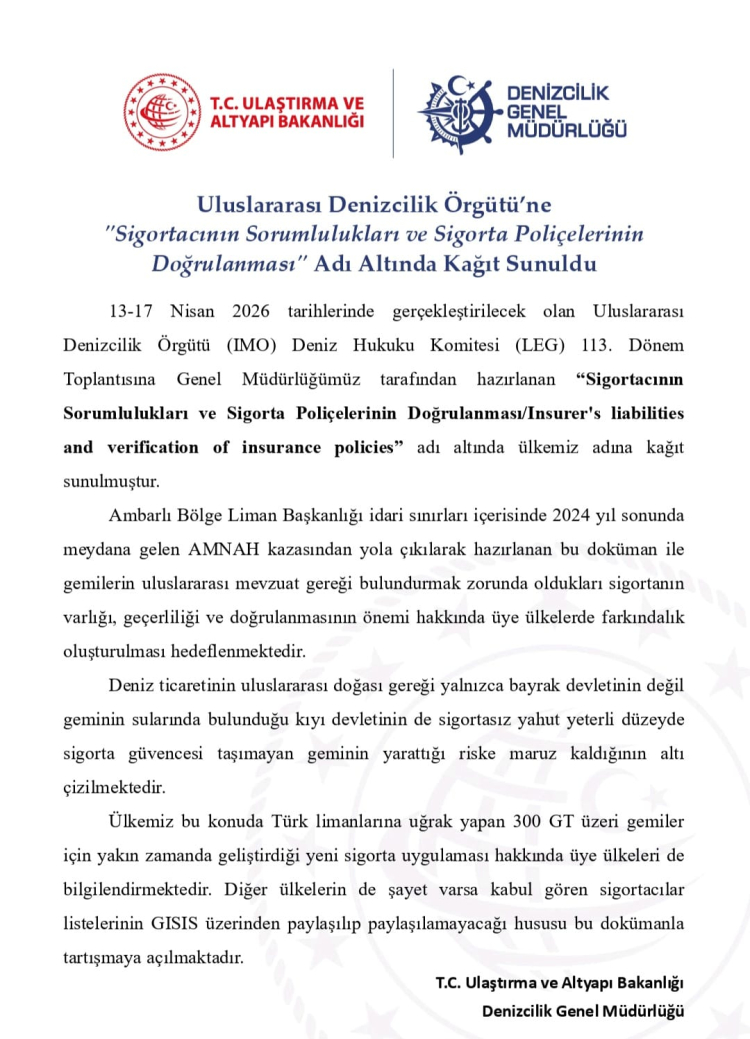 ANKARA (İGFA) – T.C. Ulaştırma ve Altyapı Bakanlığı Denizcilik Genel Müdürlüğü, Uluslararası Denizcilik Örgütü (IMO) nezdinde deniz güvenliğini yakından ilgilendiren önemli bir çalışmaya imza attı. Denizcilik Genel Müdürlüğü tarafından hazırlanan ve IMO Deniz Hukuku Komitesi’nin (LEG) 13-17 Nisan 2026 tarihleri arasında gerçekleştirilecek 113. Dönem Toplantısı’na sunulacak çalışma, “Sigortacının Sorumlulukları ve Sigorta Poliçelerinin Doğrulanması” başlığını taşıyor.