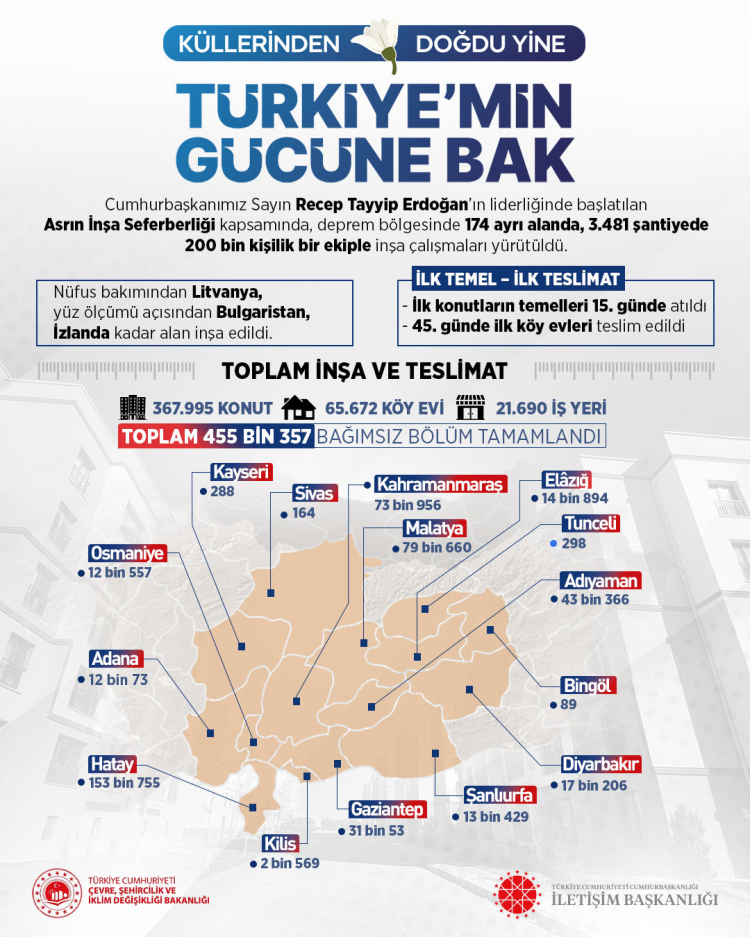 Depremin ilk dakikalarından itibaren 650 bin personelin sahaya intikal ettirildiğini vurgulayan Erdoğan, bakanlıklar, belediyeler, güvenlik güçleri, sivil toplum kuruluşları ve hayırseverlerin seferber olduğunu söyledi. Cumhurbaşkanı, “Devlet-millet dayanışmasının en güzel örneğini sergileyerek, depremin açtığı yaraları birlikte sardık. 86 milyon olarak ‘küllerimizden yeniden doğduk’ ve Türkiye’mizin gücünü tüm dünyaya bir kez daha gösterdik” ifadelerini kullandı.