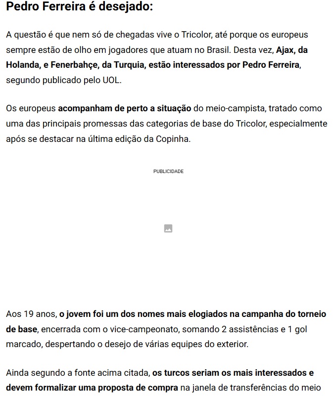 UOL’un haberine göre, Fenerbahçe, Sao Paulo forması giyen Pedro Ferreira ile yakından ilgileniyor.