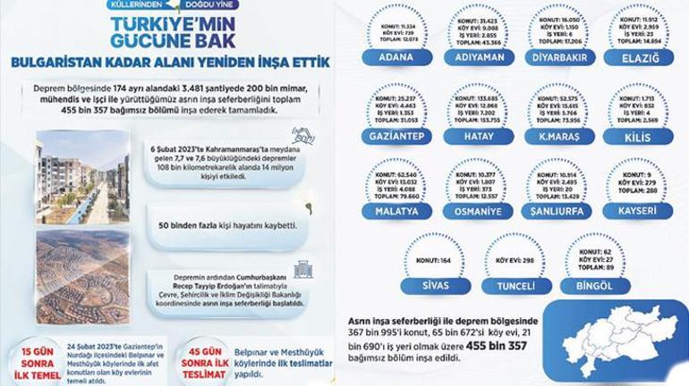 11 ili etkileyen depremin ardından başlatılan asrın inşa seferberliği kapsamında deprem bölgesinde 455 bin 357 bağımsız bölüm inşa edildi. Yerinde dönüşümle 121 bin bağımsız bölüme destek sağlandı.