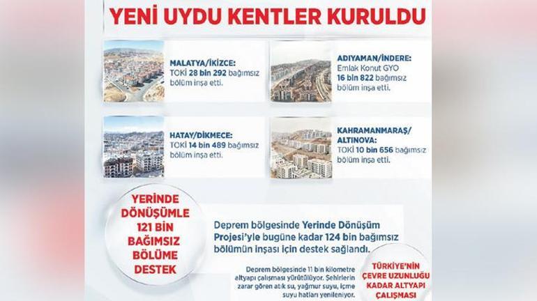 MUHALEFETE TEPKİ: Biz vatandaşlarımızın hayatını kurtarmaya, onlara yepyeni bir gelecek sunmaya çalışırken maalesef ana muhalefetin başını çektiği bazı çevreler de bu depremden siyasi rant devşirmenin hesabını yapıyordu. Millet ve memleket hayrına ne kadar proje, eser, hizmet veya yatırım varsa hepsine çamur atmayı vazife sayan bu hazımsızlar; depremzedelerimizin acılarını menfaate çevirmeye, duygularını istismar etmeye çalıştılar. Ne bir işin ucundan tuttular ne de ellerini taşın altına koydular. Sonunda hepsinin hevesi kursaklarında kaldı. İktidarımızın ve ittifakımızın enkaz altında kalmasını bekleyenler büyük hayal kırıklığına uğradı. En kısa sürede şehirlerimizi yeniden imar ve ihya ettik.