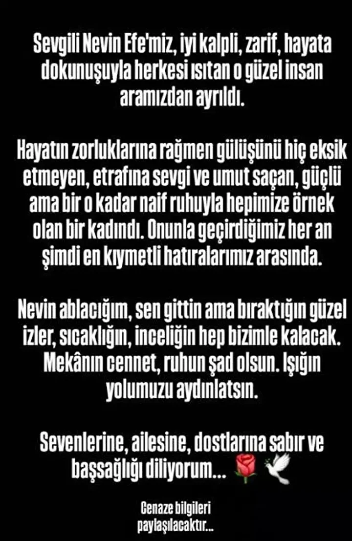 Irgan, “Sevgili Nevin Efe’miz, iyi kalpli, zarif, hayata dokunuşuyla herkesi ısıtan o güzel insan aramızdan ayrıldı. Hayatın zorluklarına rağmen gülüşünü hiç eksik etmeyen, etrafına sevgi ve umut saçan, güçlü ama bir o kadar naif ruhuyla hepimize örnek olan bir kadındı. Onunla geçirdiğimiz her an, şimdi en kıymetli hatıralarımız arasında” ifadelerini kullandı.