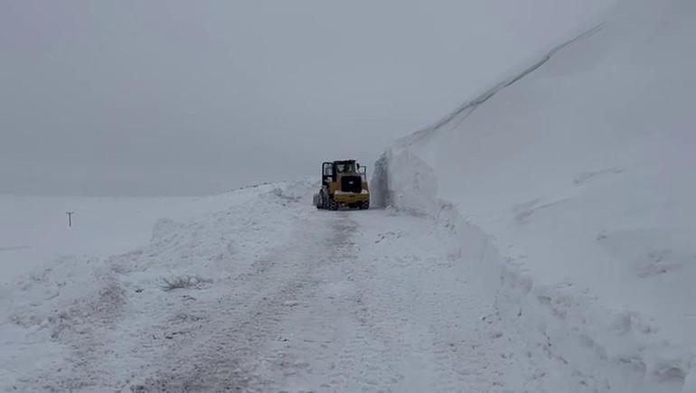 Erzurum'un Tekman ilçesinde Eğri Çayır Mezrası'nın yolunu açmak için çalışan iş makinesi yer yer 5 metreyi bulan kar yığınını açmakta zorlandı.