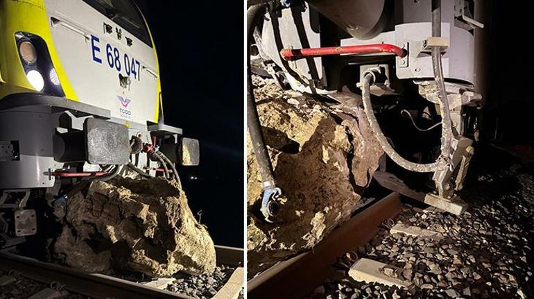 Balıkesir’in Savaştepe ilçesinde yamaçtan koparak demiryoluna düşen kaya parçasına çarpan yolcu treninin lokomotifi raydan çıktı. 150 yolcunun bulunduğu trende şans eseri kazada yaralanan olmadı.