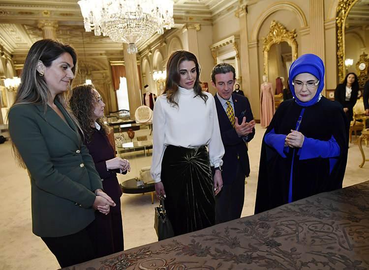 Cumhurbaşkanı Recep Tayyip Erdoğan'ın eşi Emine Erdoğan, Ürdün Kraliçesi Rania Al Abdullah'ı Dolmabahçe Sarayı'nda ağırladı. Kraliçe ve Erdoğan, Olgunlaşma Enstitüsü'nün "Tabiatın Ahenginden Kültürel Hafızaya: Nakş-ı Zaman" sergisini gezdi.