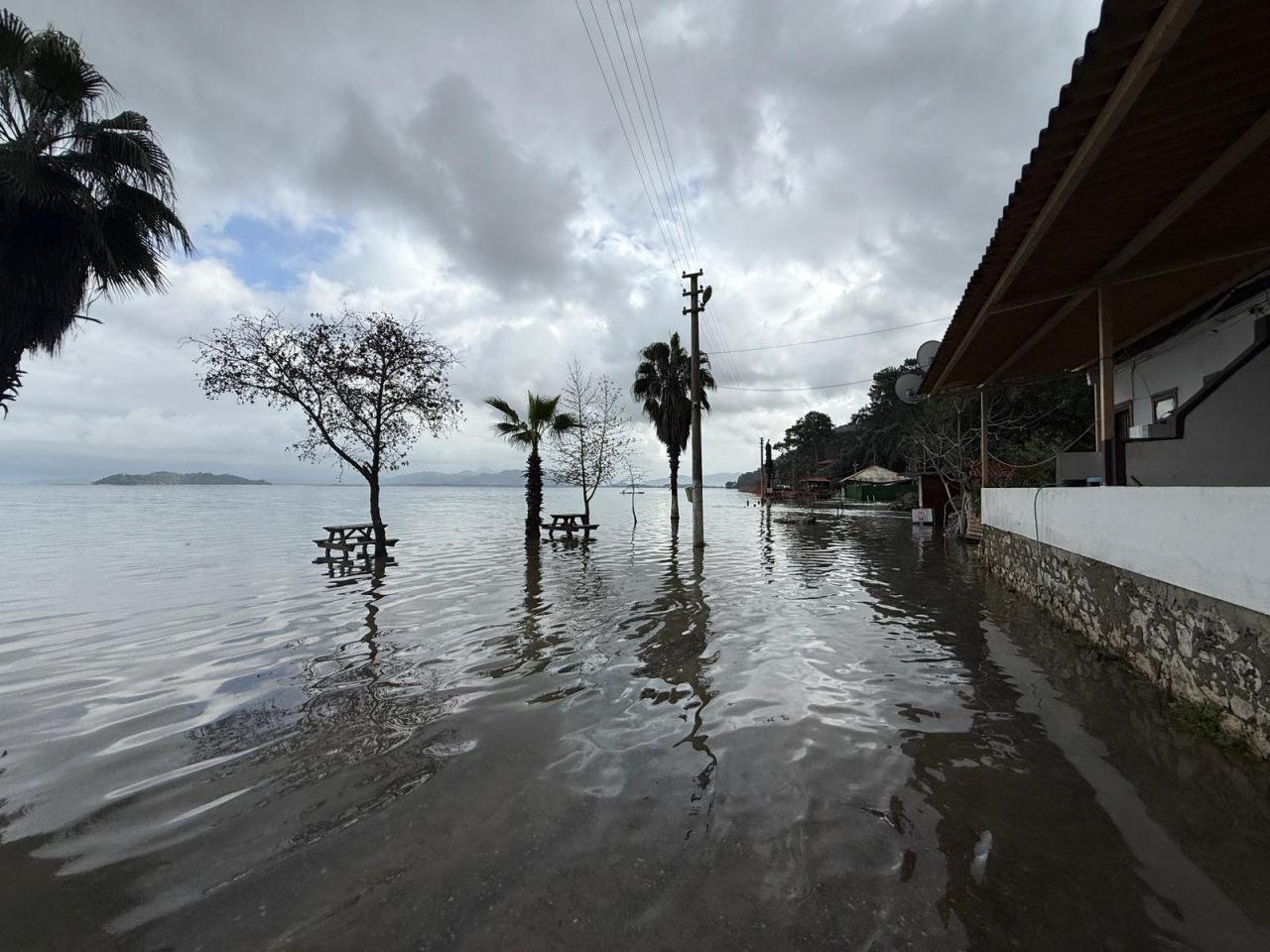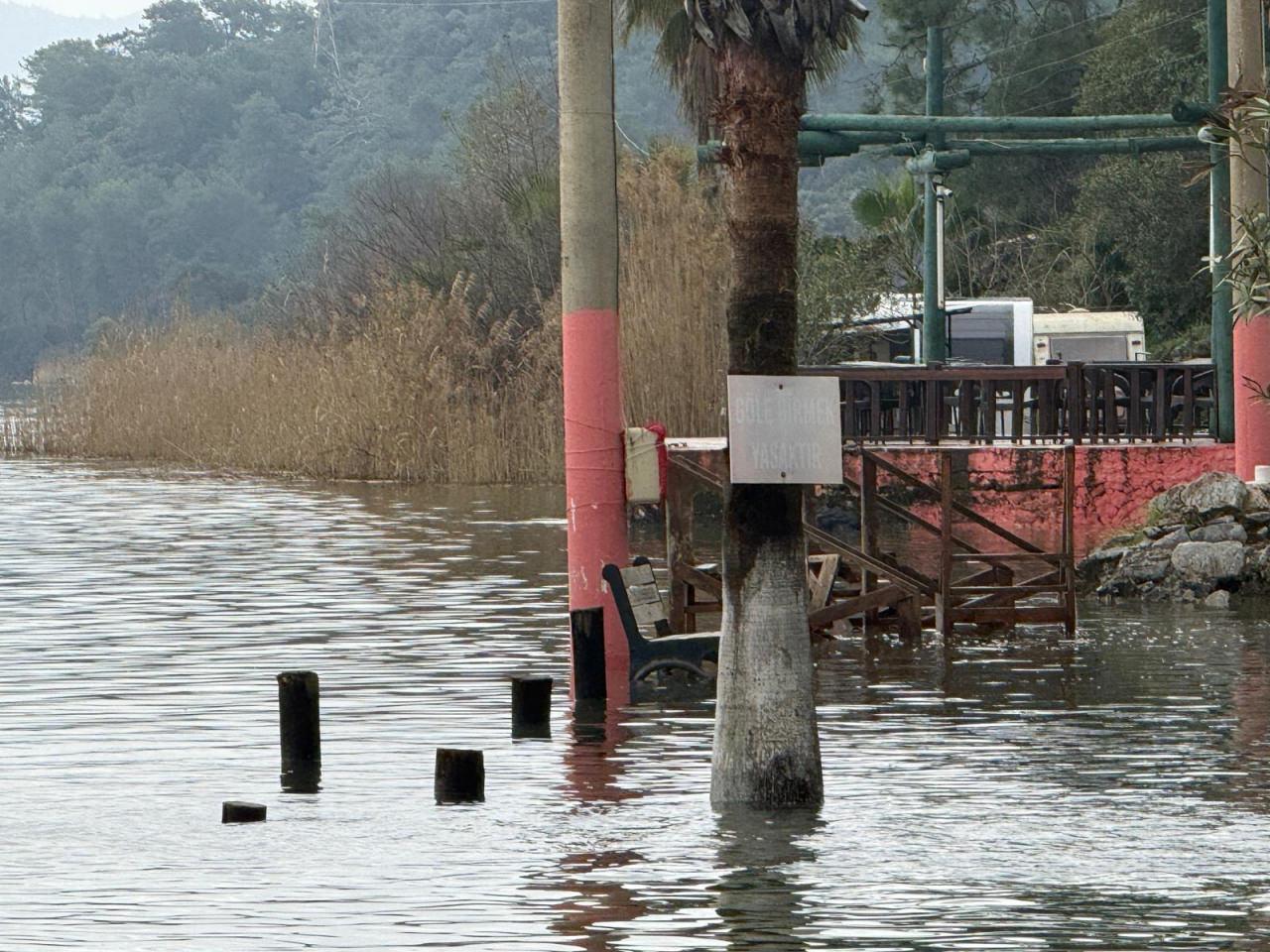 Köyceğiz ilçesinde etkili olan yağışların ardından su seviyesi yükselen Köyceğiz Gölü’nün kuvvetli lodosla taşması sonucu bölgede şifa kaynağı olarak bilinen Sultaniye Kaplıcaları ve çamur banyoları sular altında kaldı.