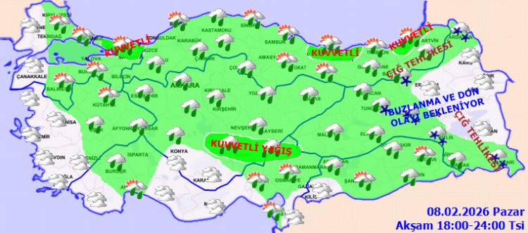 Yağışların genellikle yağmur ve sağanak, Doğu Anadolu’nun doğusu, Sivas, Bayburt, Bingöl ve Tunceli çevreleri ile Doğu Karadeniz’in yüksek kesimlerinde karla karışık yağmur ve kar şeklinde olması bekleniyor. Yağışların, Doğu Karadeniz kıyıları, Güneydoğu Anadolu’nun doğusu, İstanbul, Kocaeli, Sakarya, Yalova, Bursa, Çanakkale, Aksaray, Niğde, Ordu, Hakkari, Bitlis, Bingöl, Muş ve Şırnak çevreleri ile Balıkesir’in kuzey kesimlerinde yer yer kuvvetli olacağı tahmin ediliyor. Sabah ve gece saatlerinde doğu bölgelerde buzlanma ve don olayı bekleniyor. Doğu Karadeniz’in iç kesimlerinin yüksekleri ile Doğu Anadolu’nun doğusunda yüksek kar örtüsüne sahip eğimli kesimlerinde çığ tehlikesi bulunmaktadır.