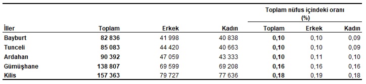 Bayburt, 82 bin 836 kişi ile en az nüfusa sahip olan il oldu. Bayburt’u, 85 bin 83 kişi ile Tunceli, 90 bin 392 kişi ile Ardahan, 138 bin 807 kişi ile Gümüşhane ve 157 bin 363 kişi ile Kilis takip etti.