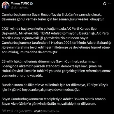 Sayın Cumhurbaşkanımızın tensipleriyle Adalet Bakanı olarak atanan Sayın Akın Gürlek’e görevinde üstün muvaffakiyetler diliyorum.”