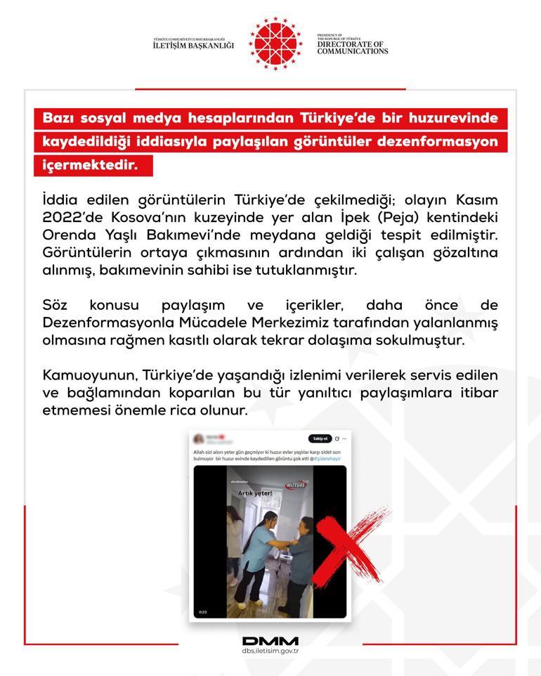 Açıklamada şu ifadelere yer verildi; “Bazı sosyal medya hesaplarından Türkiye’de bir huzurevinde kaydedildiği iddiasıyla paylaşılan görüntüler dezenformasyon içermektedir.