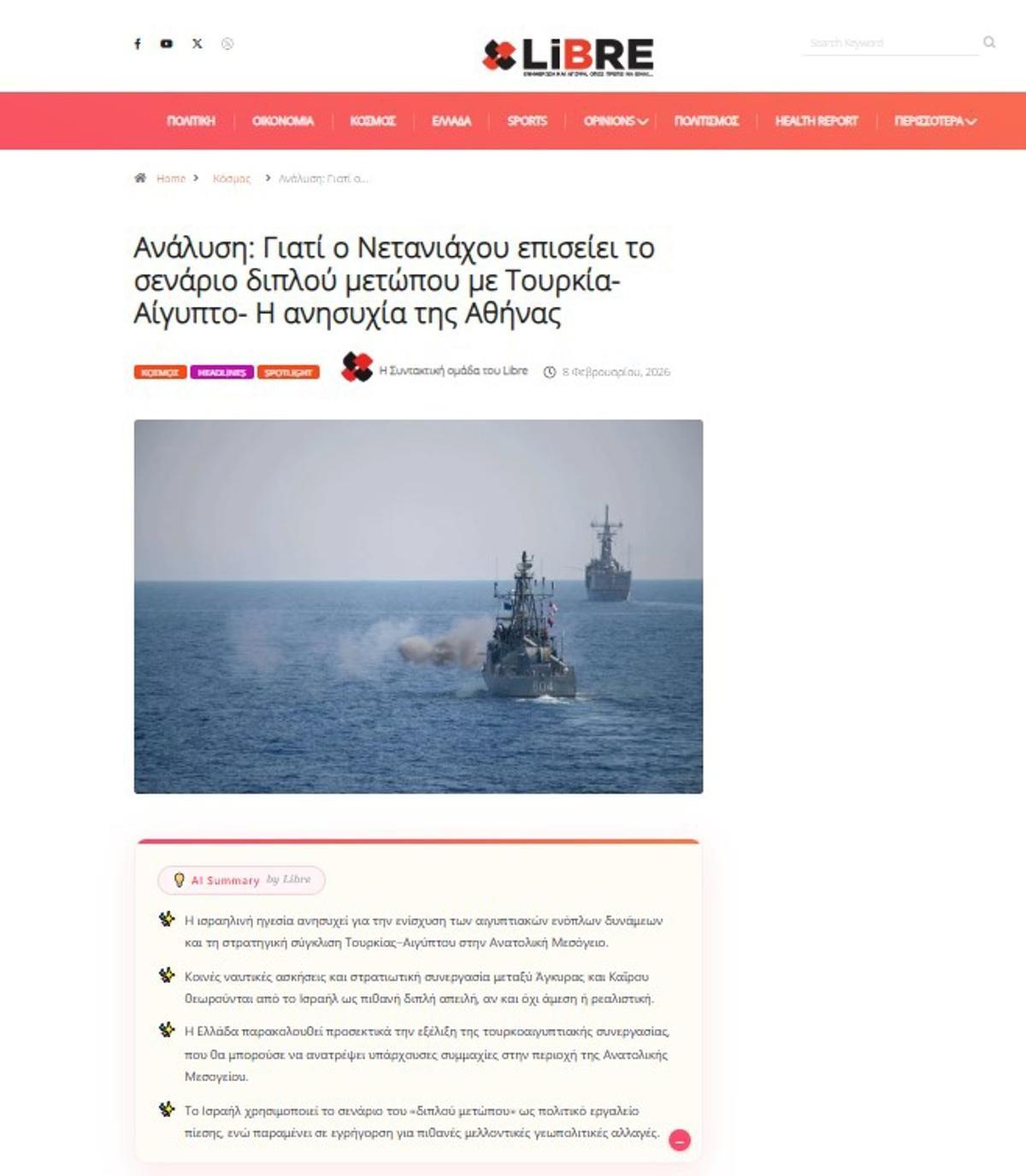 Yunan gazeteci Spyros Sideris imzalı haberde, İsrail Başbakanı Netanyahu’nun, Mısır ordusunun artan askeri kapasitesine ilişkin son açıklamalarının Tel Aviv’deki tedirginliği gözler önüne serdiği ifade edildi. Analize göre, bu endişe Türkiye-Mısır ilişkilerindeki normalleşmeyle daha da derinleşti.