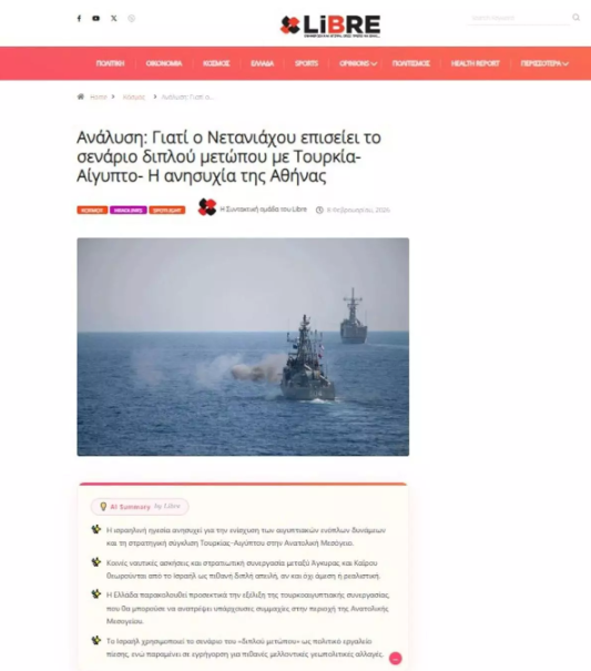 Libre’de yer alan değerlendirmede, Yunanistan’ın da İsrail gibi Türkiye-Mısır iş birliğini dikkatle takip ettiği aktarıldı. Olası bir mutabakatın, Atina’nın İsrail ve Fransa ile kurduğu deniz yetki alanları ve enerji temelli dengeleri sarsabileceği belirtildi. Kıbrıs ve Doğu Akdeniz enerji başlıklarının bu yakınlaşmayı daha da kritik hale getirdiği vurgulandı.