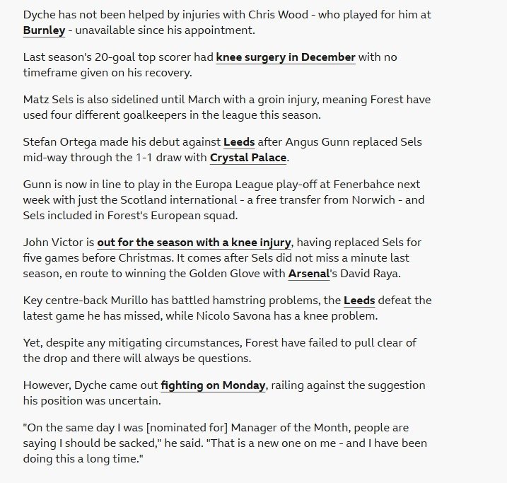 Çarşamba akşamı Nottingham Forest’ın başında 25. maçına çıkacak olan Dyche’ın takımı, düşme hattındaki West Ham’ın sadece iki puan önünde bulunuyor.