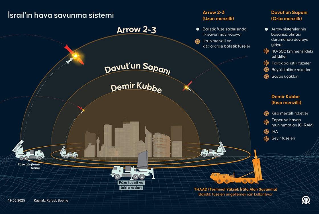 İsrail’in hava savunma sistemi mimarisi, Demir Kubbe (4-70 kilometre), Davut Sapanı (40-300 kilometre), Arrow 2 (500 kilometre) ve Arrow 3 (2 bin 400 kilometre) olmak üzere 4 katmana ayrılıyor.