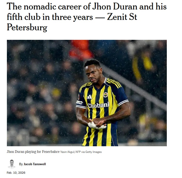 The Athletic, Fenerbahçe’den ayrılarak Zenit’e transfer olan Jhon Duran’ın kariyer yolculuğuna da değinerek Kolombiyalı oyuncunun son 3 yılda 5. takımına transfer olduğunu belirtti. Duran’ın 15 ay önce Aston Villa ile 2030 yılına kadar sözleşme imzaladığı ve 22 yaşındaki santrforun durumunun giderek tuhaf bir hal almaya başladığı kaydedildi.