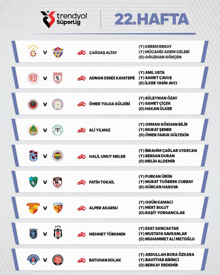 Süper Lig'de 22. haftada görev alacak hakemler belli oldu. Trabzonspor-Fenerbahçe maçını Halil Umut Meler yönetecek.
