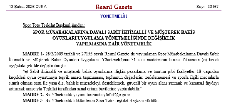Buna göre, sabit ihtimalli ve müşterek bahis oyunlarına ilişkin pazarlama ve tanıtım faaliyetleri artık 18 yaşından küçükleri oyun oynamaya teşvik etmeyecek, toplumun değerlerini zedelemeyecek ve yalnızca sporla ilgili mecralarla sınırlı olacak şekilde yürütülebilecek.