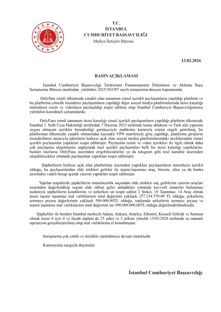 İSTANBUL (İGFA) – İstanbul Cumhuriyet Başsavcılığı Terörizmin Finansmanının Önlenmesi ve Aklama Suçu Soruşturma Bürosu tarafından yürütülen 2025/263337 sayılı soruşturma kapsamında, kamuoyunda “OnlyFans soruşturması” olarak bilinen dosyada önemli bir operasyon gerçekleştirildi.