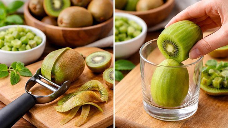 Asıl şaşırtıcı yöntem ise yumuşak ve olgun kiviler için geçerli. Eğer kivi bastırdığınızda hafifçe içe çöküyorsa onu soymak için bıçakla uğraşmanıza gerek yok. Tek ihtiyacınız olan şey sıradan bir su bardağı. Kiviyi ortadan ikiye kesin. Ardından yarısını alın ve kabuğun alt kısmını bardağın kenarına yerleştirin. Meyveyi yavaşça aşağı doğru itin.