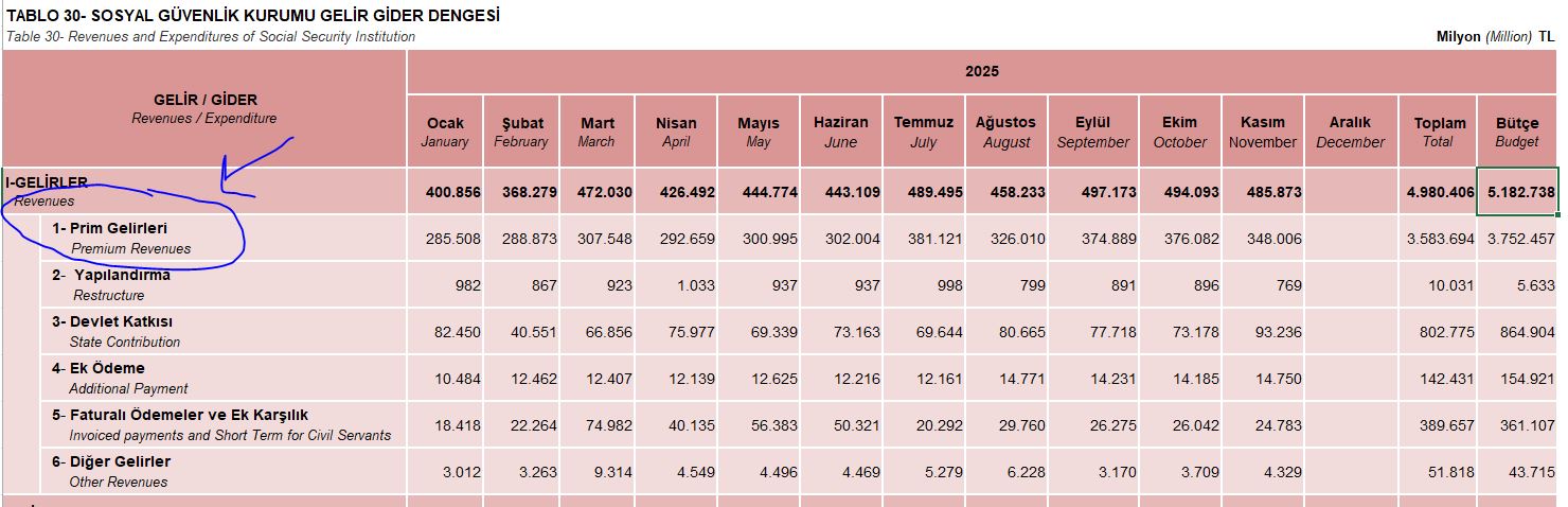SGK istatistiklerinde bu tutar, gelir tablosunda “prim gelirleri” kalemi altında yer alır.
