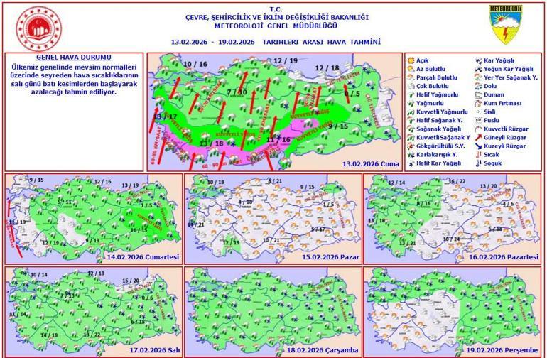 Meteoroloji Genel Müdürlüğü olarak yapılan değerlendirmelere göre: Ülkemiz genelinin çok bulutlu, Marmara, Ege, Akdeniz, İç Anadolu, Akdeniz, Batı Karadeniz, Orta ve Doğu Karadeniz’in iç kesimleri, Doğu Anadolu’nun güney ve batısı, Güneydoğu Anadolu ile Erzurum ve Ağrı çevrelerinin yağışlı geçeceği tahmin ediliyor. Yağışların; genellikle yağmur ve sağanak, Kıyı Ege ve Akdeniz kıyılarında yer yer gök gürültülü sağanak, Akdeniz ve Karadeniz’in iç ve yüksek kesimleri ile Doğu Anadolu’nun kuzey ve doğusunda karla karışık yağmur ve kar şeklinde olması bekleniyor. Yağışların; Güney ve Kıyı Ege, Akdeniz, İç Anadolu’nun güneyi, Doğu Anadolu’nun güney ve batısı ile Erzurum, Çanakkale, Adıyaman çevreleri, Balıkesir, Gaziantep, Kilis ve Diyarbakır’ın batısında kuvvetli, İzmir’in güneyi, Aydın, Muğla, Antalya, Burdur ve Isparta illerinin güneyi, Mersin, Adana, Osmaniye, Kahramanmaraş ve Malatya çevreleri, Kayseri’nin güneyinde çok kuvvetli ve yerel şiddetli olması bekleniyor. Sabah ve gece saatlerinde doğu bölgelerde buzlanma ve don olayı bekleniyor. Doğu Karadeniz’in iç kesimlerinin yüksekleri ile Doğu Anadolu’nun doğusunda yüksek kar örtüsüne sahip eğimli kesimlerinde çığ ve kar erimesi tehlikesi bulunmaktadır.