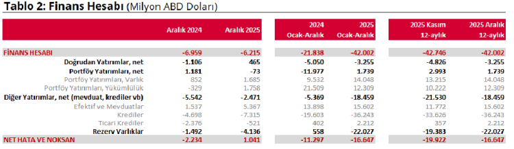 2025 yılı Aralık ayı itibarıyla yıllıklandırılmış cari açığın finansmanında; net doğrudan yatırımlar 3,3 milyar dolar katkı, krediler ise 36,2 milyar dolar katkı sağlandı.