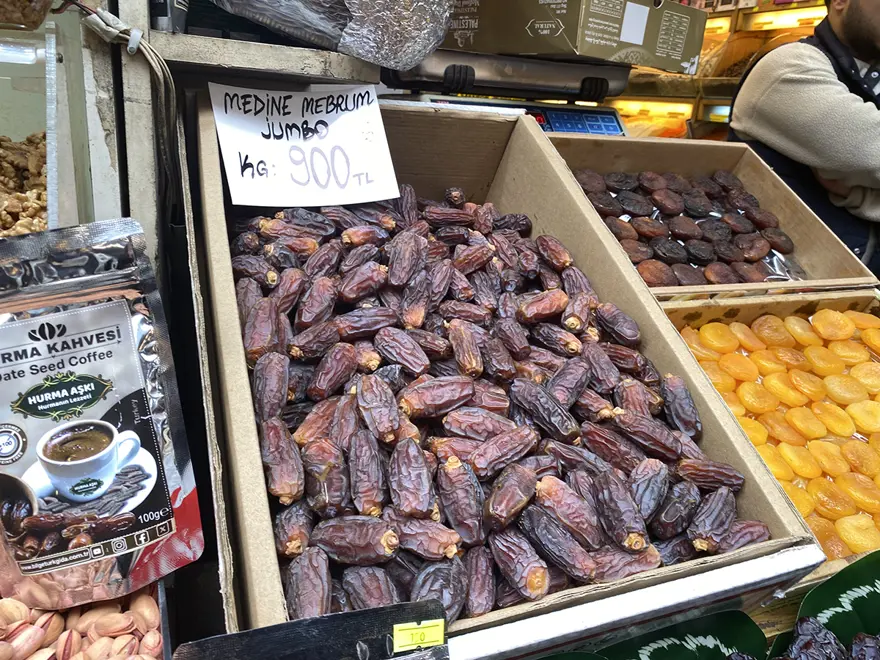 Ramazana sayılı günler kala hurma satışlarında da yoğun talep var. Eminönü esnafının hurma piyasasını incelediğimizde fiyat aralığı 420-960 lira arasında değişiyor. Hatta bin liraya kadar çıkıyor. Esnaf vatandaşların hurmaya ilginin yoğun olduğunu aktarırken her bütçeye göre hurma satışının olduğunu belirtiyor. Hurma satışı yapan esnafın tezgahlarında kilogramla satışın yanında dikkat çeken bir değer satış ise tane ile satışların başlaması oldu.