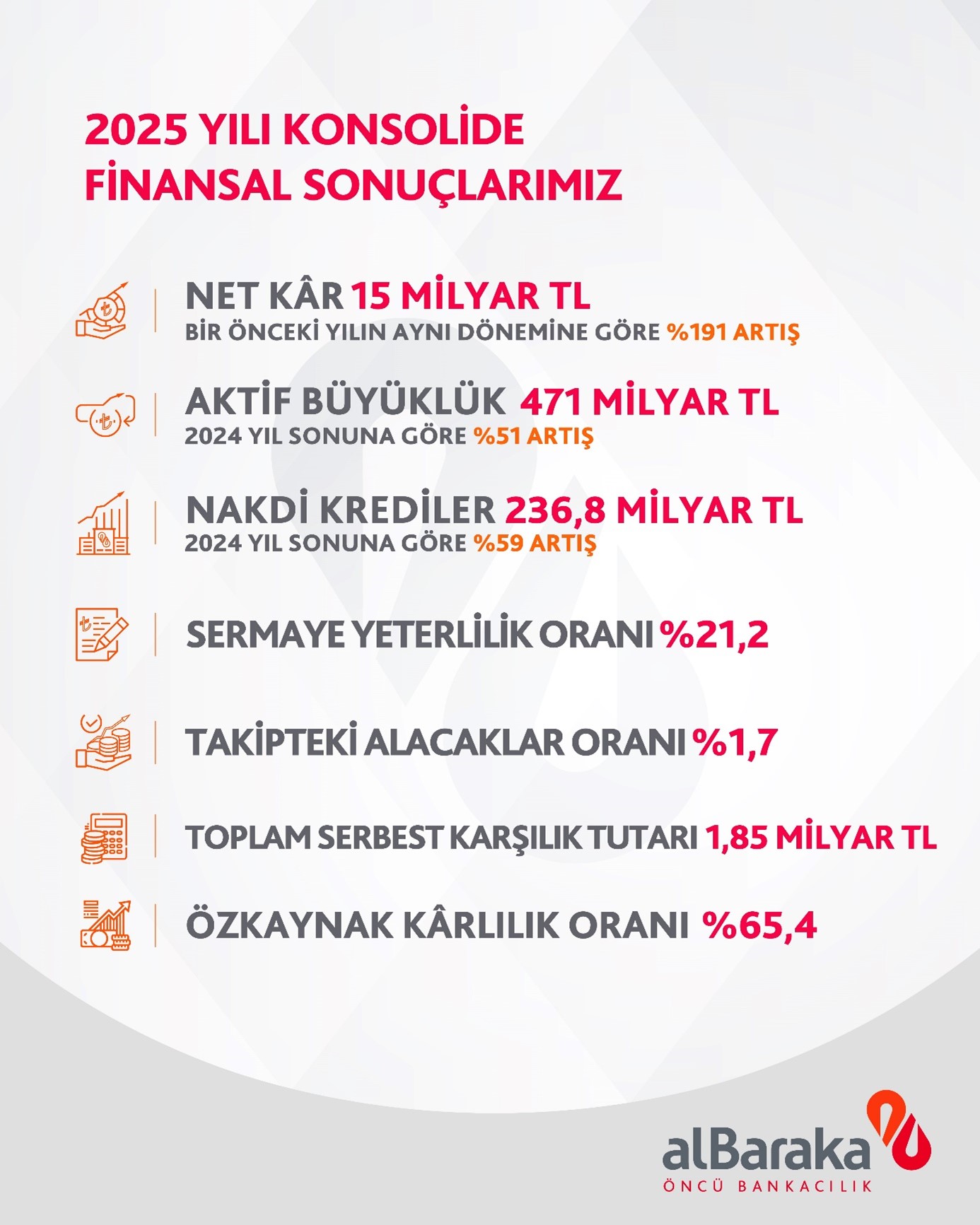 Albaraka Türk Katılım Bankası, 2025 yılı finansal sonuçlarını açıkladı. Banka, sergilediği güçlü performansla hem kâr üretimi hem de aktif kalitesi açısından başarılı bir yıl geçirdi. Konsolide finansal sonuçlara göre, toplam aktif büyüklük bir önceki yıla göre %51 artarak 471 milyar TL’ye ulaşırken net kâr %191,1’lik artışla 15 milyar TL olarak gerçekleşti. Bankanın ekonomiye sağladığı nakdi kredi desteği 237 milyar TL, gayri nakdi kredi desteği ise 67 milyar TL olmak üzere toplam kredi desteği 300 milyar TL’nin üzerine yükselmiştir.