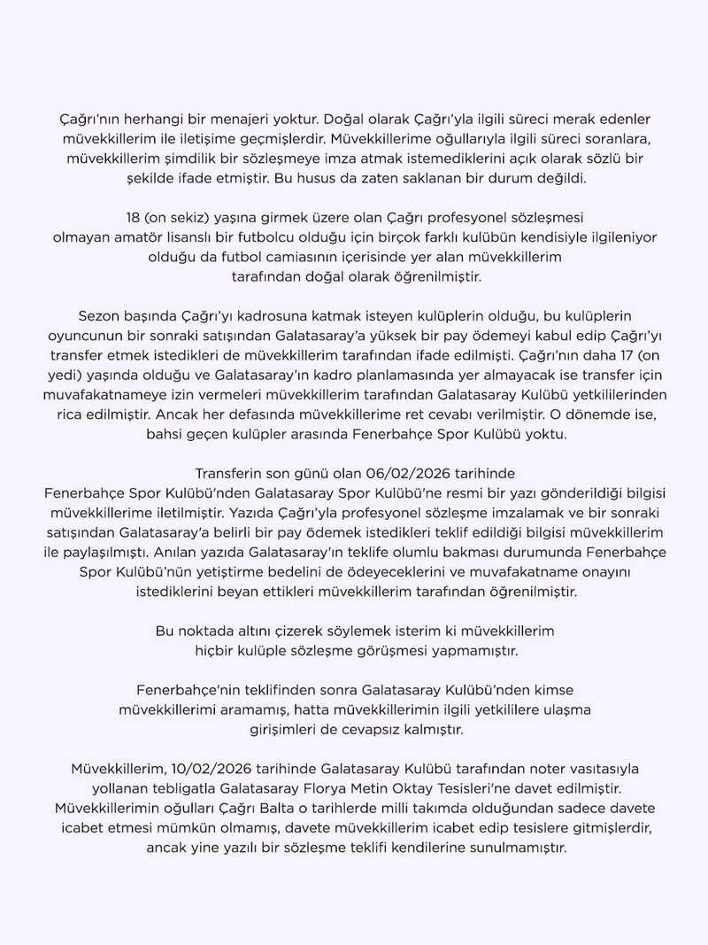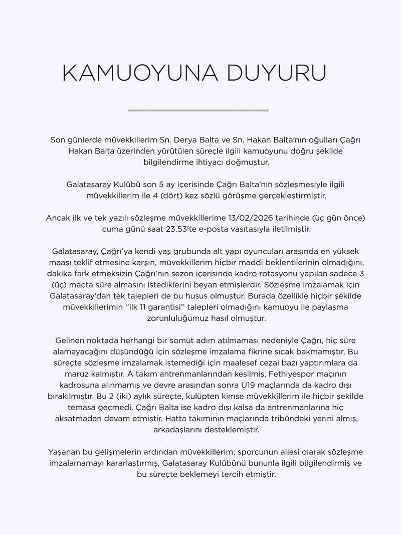 Galatasaray altyapısında forma giyen Çağrı Hakan Balta’nın geleceğine ilişkin dikkat çeken bir açıklama yapıldı. Genç oyuncunun avukatı tarafından yapılan yazılı açıklamada, kontrat sürecine dair kamuoyunda oluşan iddialara yanıt verildi.